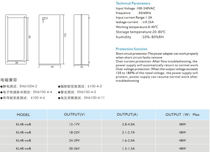 過流保護:過流故障排除后,電源將自動恢復(fù)正常工作 過壓保護:當(dāng)輸出電壓超過額定電壓的150~180%時,電源將保護,故障排除后電源能恢復(fù)正常工作 輸入電壓:100-240VAC 頻率:50/60Hz 輸入電流:1.2A 漏電電流:<0.25A 工作溫度:0-40℃ 貯藏溫度:-20-80℃ 濕度:10%-80%RH" />