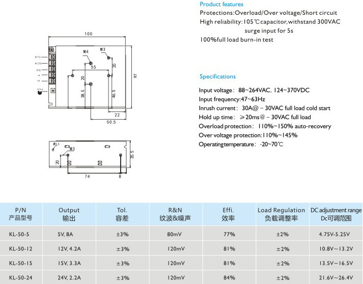 高可靠性:105C長壽命電容,能承受300VAC輸入電壓5秒不損壞 100滿載老化測試 輸入電壓:88-264VAC124-370VDC 輸入頻率:47~63Hz 沖擊電流:30A@-30VAC滿載冷態(tài) 保持時(shí)間:≥20ms@230VAC滿載 過載保護(hù):110%-150%自動(dòng)恢復(fù) 過壓保護(hù):110%~145% 運(yùn)行溫度:-20-70℃" />