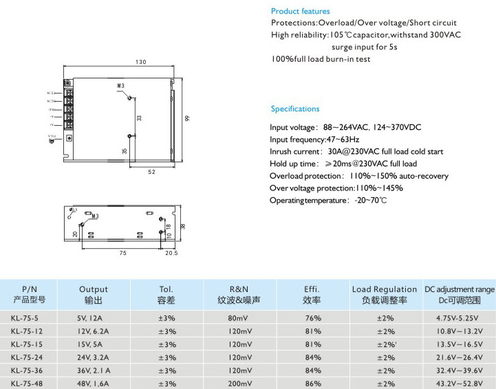 高可靠性:105C長壽命電容,能承受300VAC輸入電壓5秒不損壞 100滿載老化測試 輸入電壓:88-264VAC124-370VDC 輸入頻率:47~63Hz 沖擊電流:30A@230VAC滿載冷態(tài) 保持時間:≥20ms@230VAC滿載 過載保護:110%-150%自動恢復 過壓保護:110%~145% 運行溫度:-20-70℃" />